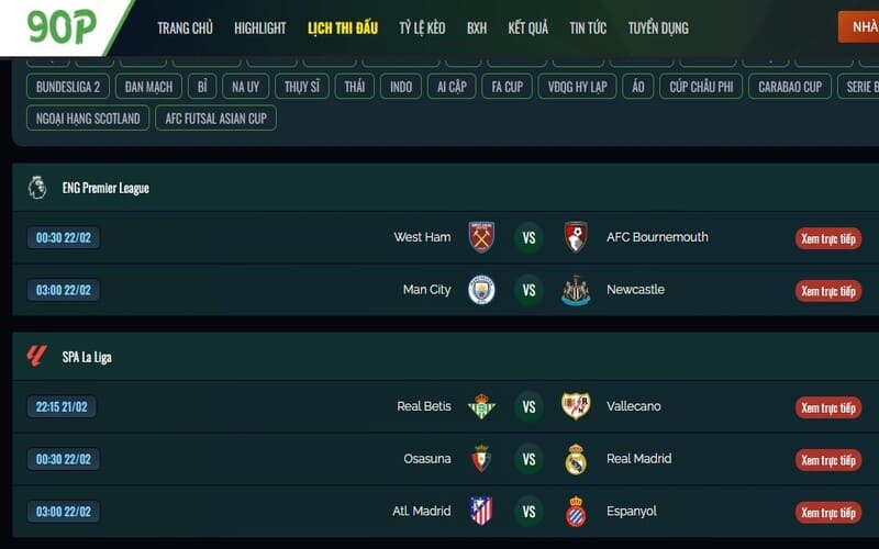Không cần phải lùng sục trên nhiều trang web khác nhau để biết lịch thi đấu của đội yêu thích. 90Phut TV tổng hợp lịch thi đấu của hàng chục giải đấu trên toàn thế giới, cập nhật liên tục và hiển thị theo giờ Việt Nam để bạn không bị nhầm lẫn múi giờ.
