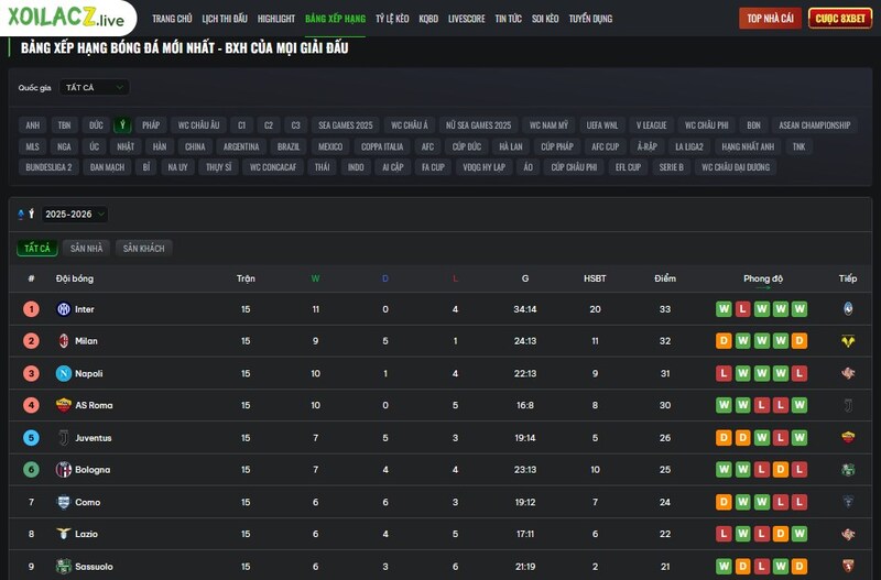 Và đó là lý do mình thường xuyên sử dụng Xoi Lac – một nền tảng không chỉ mạnh về link xem trực tiếp bóng đá, mà còn cực kỳ tiện để anh em theo dõi bảng xếp hạng các giải đấu lớn, đặc biệt là những giải mình quan tâm như Serie A với bảng xếp hạng bóng đá Ý luôn biến động từng vòng.